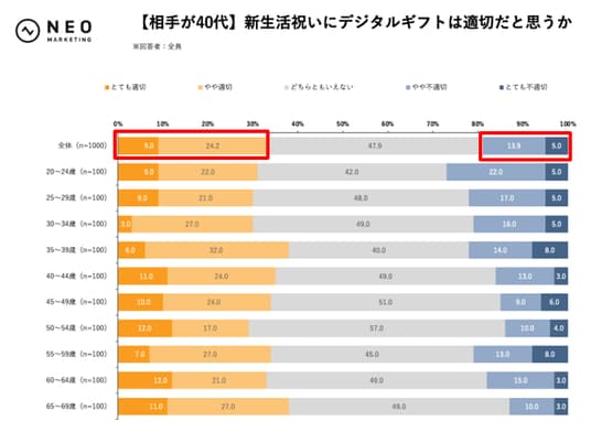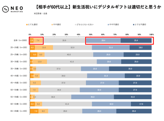 新生活祝いを贈る場合、デジタルギフトは適切だと思うかを、贈る相手の年代別でお聞きしました。