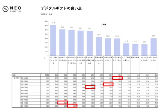 例えば20~24歳では「住所を聞かなくて済む」28.0%、30~34歳では「少額から贈りやすい」25.0%、35~39歳では「遠方の人にも簡単に贈れる」36.0%と高めでした。