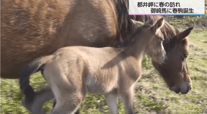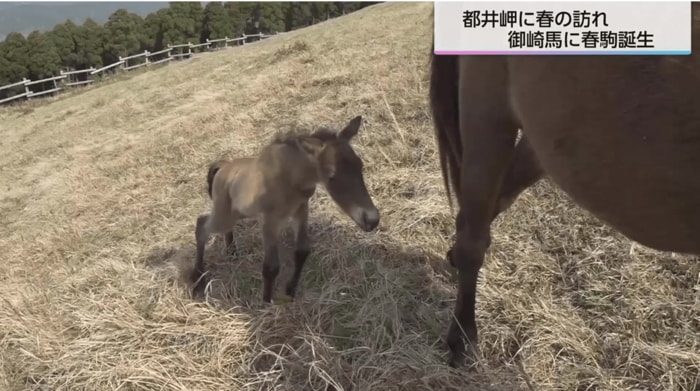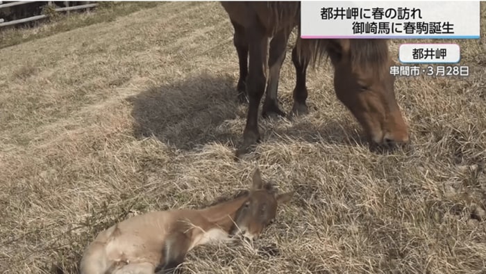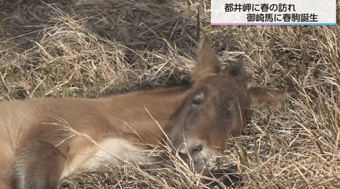 宮崎県串間市の都井岬で、国の天然記念物に指定されている野生馬「御崎馬(みさきうま)」に、2026年初めてとなる春駒が誕生した。母親のそばで眠ったり、おぼつかない足取りで歩いたりする愛らしい姿を見せている。