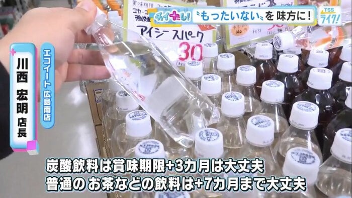 「炭酸飲料は賞味期限から3か月ほど、お茶などの飲料は7か月まで大丈夫。調味料はものによっては1年ほど問題なく使えるものもある」と川西宏明店長は説明する。