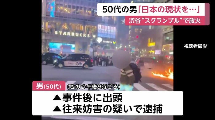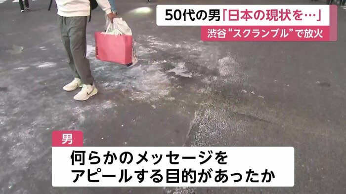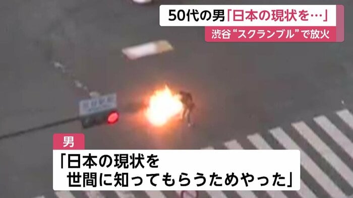 東京・渋谷区のスクランブル交差点でガソリンのような液体をまき火をつけた疑いで男が逮捕された事件で男は「日本の現状を世間に知ってもらうためやった」と供述していることが分かった。