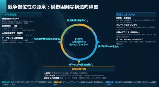 Z-GEOの競争優位性は、以下の3つの領域が相互に強化し合う構造に支えられており、プロジェクトを重ねるごとに競合との差は縮まるのではなく、拡大し続けます。- 科学的厳密性(模倣の壁:特許で法的コピー不可) 特許出願済VSCA(TM)アルゴリズム。1,000+プロンプト×全AIエンジン=1万+データポイント・100万+テキスト。IPローテーション+統計サンプリングによるAI回答の安定性・再現性確保。