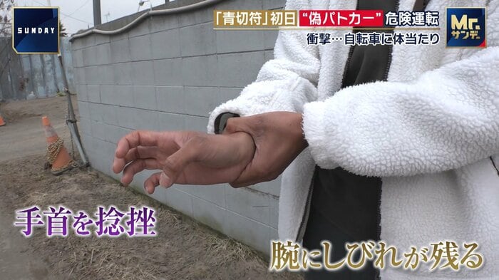ドアミラーがひじに接触。手首を捻挫し、今もしびれが残っているという。