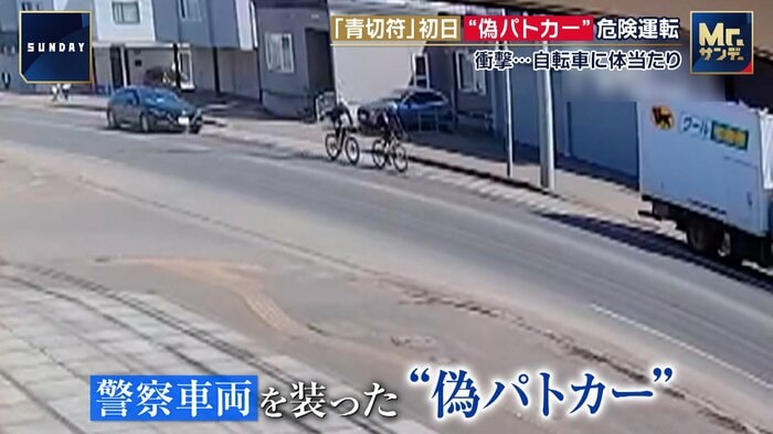 約1km先にあるカメラには、2台の自転車に接近して走る“偽パトカー”が!