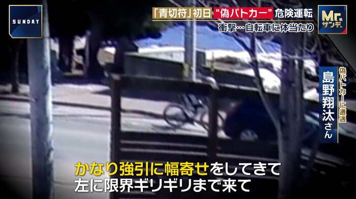現場は、車と自転車が安全な距離を取って走行できる道幅があるが、別のカメラは、車が歩道側に寄り、自転車の真横を走行する様子を捉えていた。