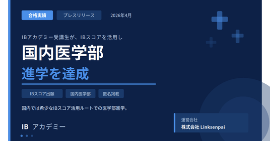 株式会社Linksenpai(所在地:東京都渋谷区、代表取締役:吉田志織)が運営するIB(国際バカロレア)専門オンライン家庭教師サービス「IBアカデミー」は、在籍生徒の一人が2026年4月、IBスコアを活用した出願により国内医学部への進学を果たしたことをご報告します。