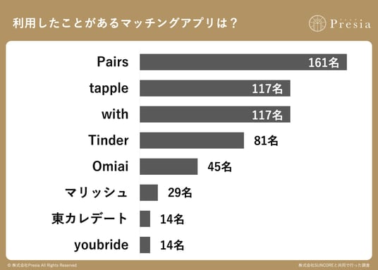 利用アプリ1位はPairs(161名)。tappleとwithが同率2位(各117名)で続く
