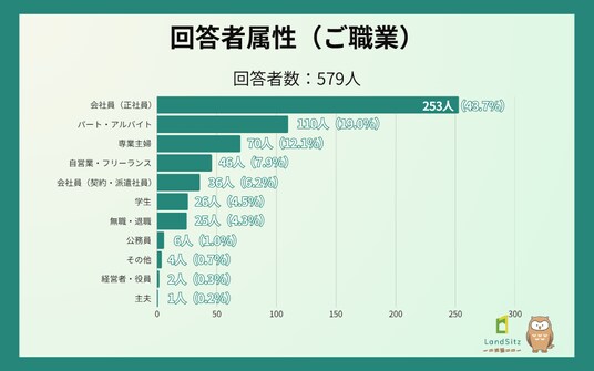 今回の調査では、女性が74.3%(430名)、男性が25.7%(149名)という構成となりました。年代は30代が65.8%(381名)と多数を占め、職業では「会社員(正社員)」が43.7%(253名)で最多、次いで「パート・アルバイト」19.0%(110名)、「専業主婦」12.1%(70名)と続き、多様な就労形態の方が回答しています。
