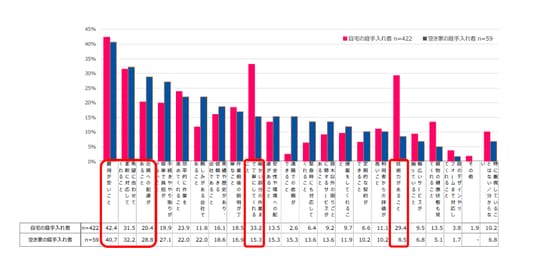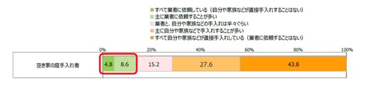 ・管理する空き家の庭については「すべて自分や家族などが直接手入れしている」が約43.8%となり半数を下回る結果に。約13.4%が主に業者に依頼しながら庭の管理を維持している結果となった。