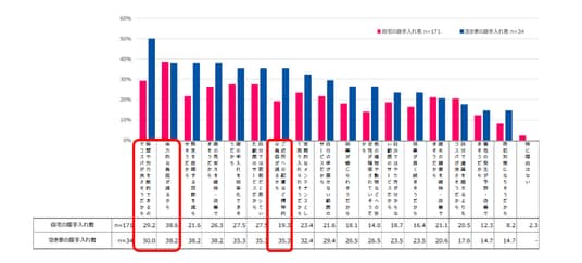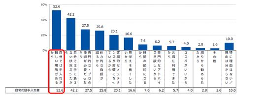 ・業者に依頼する理由は自宅・空き家共通で、時間や体力負担の軽減よりも、専門性が必要性な「自分では手が届かない場所・作業の依頼」が50%以上と中心となった。