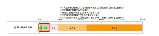 ・自宅の庭について、業者への依頼有無について全体でみると、「すべて自分や家族などが直接手入れしている」が約54.6%と半数を超える。主に業者に依頼する人は約9.2%と少数となった。