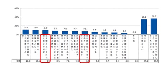 暮らしの中での防犯に関する意識について、「防犯に不安」と回答したのは約32.2%の人が感じておられました(表10)。また、周囲の空き家に関する防犯への不安面は、「空き家からの火災・放火などの不安」が約9.9%、「不法侵入・窃盗など治安悪化の不安」が約7.5%となり、管理されていない空き家に対して一定数の近隣住民が不安を感じていることが分かりました(表11)。