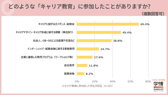 キャリア教育に参加したことがある学生に、その内容を聞くと(複数回答可)、「キャリアに関するガイダンス・説明会」が69.4%で最多。次いで、「キャリアデザイン・キャリア形成に関する授業(単位あり)」が49.4%に上り、半数が授業で経験していることが分かりました。さらに、「社会人、OB・OGによる講演や交流など」38.8%、「インターンシップ・就業体験に関する事前教育」24.7%が続きました。「企業と連携した教育プログラム(ワークショップ等)」は17.6%、「会社見学」11.8%、「就業体験」8.2%で、企業が関わるプログラムに参加した学生は少数でした。