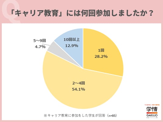 キャリア教育に参加したことがあると回答した学生に、参加回数を尋ねたところ、「2~4回」が54.1%で過半数を占めました。複数回参加した学生が7割を超えましたが、「10回以上」は12.9%、「5~9回」は4.7%にとどまりました。