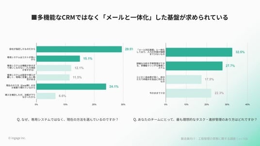 専用システムを導入しない理由として「現場に定着しない懸念(23.5%)」を挙げる割合は、全業種の倍以上に達しました。現場の32.53%が求める理想は、高機能な独立ツールではなく、「日常的に使うメール画面の中で、タスクや工程の進捗がそのまま把握できるシンプルな仕組み」であることが判明しました。