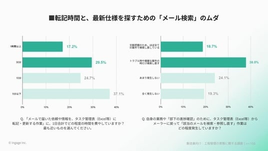 製造業の57.8%が、管理表を見ても詳細な文脈が不明なため、結局「部下への確認」や「メールの検索」をやり直していますまた、メールから管理表・ツールへの転記作業に1日30分以上費やす層も46.7%に達しており、現場の生産性を著しく阻害しています。
