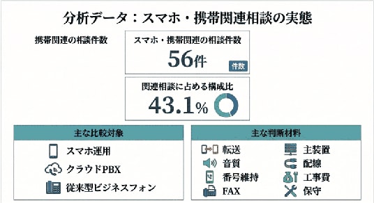 その結果、スマホ・携帯関連の相談は56件、関連相談の43.1%を占め、比較対象が固定電話同士ではなく「スマホで代替できるか」へ移っている実態が確認されました。