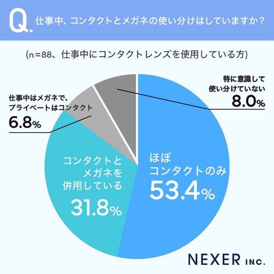 「コンタクトとメガネを併用している」は31.8%、「特に意識して使い分けていない」は8.0%、「仕事中はメガネで、プライベートはコンタクト」は6.8%でした。