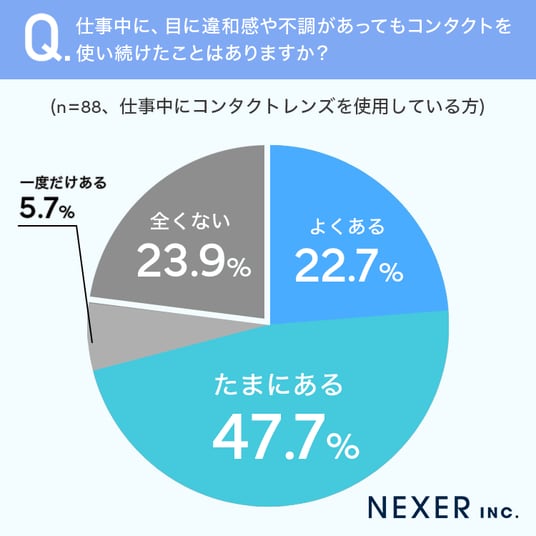 続いて、仕事中にコンタクトレンズを使用している方に、目に違和感があってもコンタクトを使い続けたことがあるかを聞いてみました。
