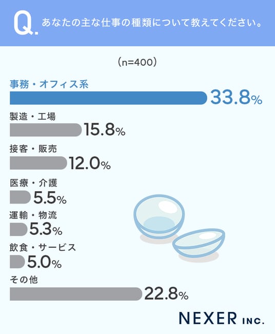オフィスワークが中心の事務職から、常に動きが求められる製造・接客の現場まで、今回の調査にはさまざまな働き方の方々が参加しています。業種によって目にかかる負担や求められる視界の広さも異なるため、コンタクトレンズの活用法にも違いがありそうです。