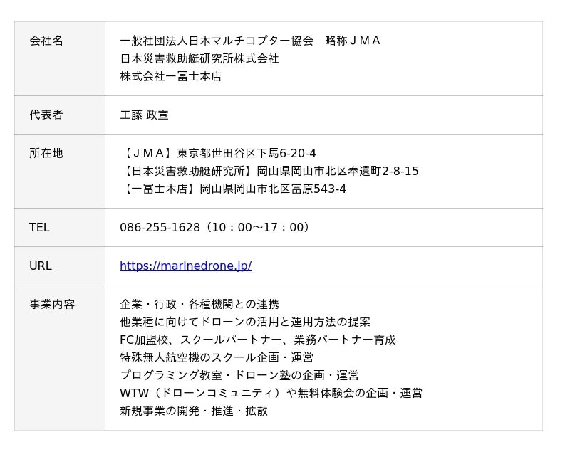JMA(正式名称:一般社団法人日本マルチコプター協会 本社:東京都世田谷区、代表理事:工藤 政宣)・日本災害救助艇研究所株式会社(本社:岡山県岡山市北区、代表取締役:工藤 政宣)・株式会社一冨士本店(本社:岡山県岡山市北区、代表取締役:工藤 政宣)(以下、マリンドローン共同開発チーム)は、既に開発を発表している水上ドローン「マリンドローン」を活用した警戒船業務の無人化および事業化に向けた検討を開始したことをお知らせいたします。本取り組みは、これまでの実証実験により確認された遠隔操縦技術および長時間運航性能を背景に、水域における監視・警戒業務の省人化・安全性向上を目的とするものです。