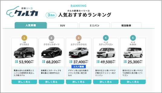 ■新車カーリース「クルカ」 3月人気車種ランキング|https://newcar.shop/