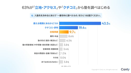 アンケート調査から見えてきたのは、「合格実績」を重視する保護者が多い一方で、全体の6割以上がいきなり実績を比較するのではなく、「立地やクチコミ」から塾を探し始めているという現状です。