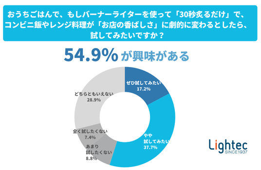そこで「たった30秒で食事を豊かにできるなら興味があるか」と尋ねたところ、約70%が「興味あり」と回答しました。また、「炙るだけで香ばしさが加わるなら試したい」も54.9%と過半数にのぼり、短時間で食体験を向上させる“リクック(再調理)“への期待が高いことが明らかになりました。