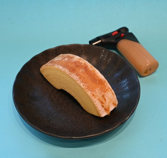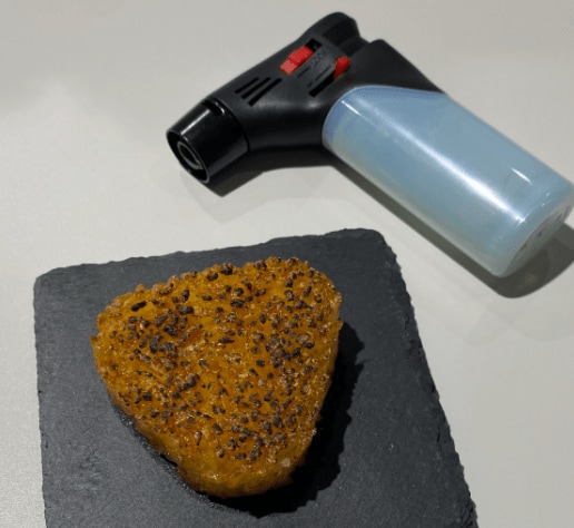 表面がパリッと焼き上がり、ほろ苦さと甘さが引き立つ新しいデザート体験に。炙っている過程の見た目も楽しめる一品。