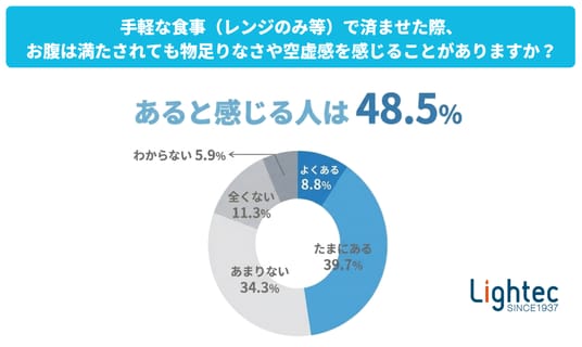 次に手軽な食事(レンジのみ等)で済ませた際、お腹は満たされても物足りなさや空虚感を感じることがあるか尋ねたところ、約48%が「物足りなさや空虚感を感じる」と回答。時短だけでは満足度を十分に満たせていないことが分かりました。