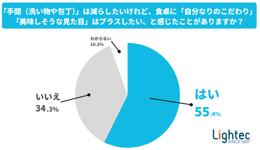 そこで、「手間(洗い物や包丁)」は減らしたいけれど、食卓に「自分なりのこだわり」や「美味しそうな見た目」はプラスしたい、と感じたことがあるかどうか尋ねたところ、「はい」と回答した人は55.4%にのぼりました。効率と体験価値の両立を求める傾向が見られます。