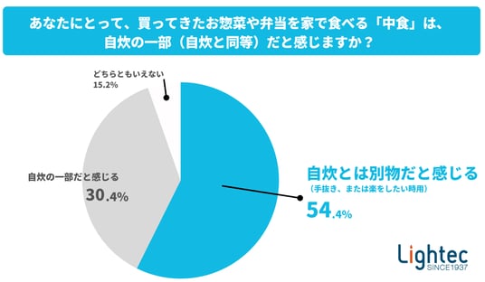 最後に、「買ってきたお惣菜や弁当を家で食べる“中食“は、自炊の一部(自炊と同等)だと感じますか?」という問いに対し、54.4%が「自炊とは別物(手抜き、または楽をしたい時用)だと感じる」と回答し、中食を“非日常の選択肢“として捉える意識が過半数を占めました。