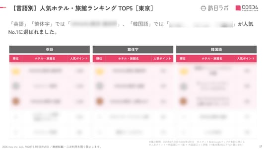業界最大級のインバウンドビジネスメディア「訪日ラボ」及び 店舗向け集客一元化プラットフォーム「口コミコム」を運営する株式会社mov(代表取締役:渡邊 誠、本社:東京都渋谷区、以下mov)は、東京都のホテル・旅館に寄せられた最新の口コミデータから、独自の『インバウンド人気ホテル・旅館ランキング』を発表しました。
