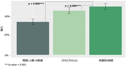 - Study 2では、20~60歳の日本人3000名を対象にランダム化比較試験を実施しました。被験者は、(1)環境・人権保護(従来型サステナビリティ、図2)、(2)ファストファッション(図3)、(3)快適性の持続(新しいサステナビリティ、図4)の3群にそれぞれ1,000名ずつ無作為に割り当てられ、各コンセプトシートを提示された後に魅力度を評価しました。その結果、「快適性の持続」の魅力度は50.5%と最も高く、ファストファッション(46.2%)および従来型サステナビリティ(34.5%)を有意に上回りました。この結果は、消費者の利己的動機に基づくサステナビリティ概念が、低価格を武器とするファストファッションをも凌駕する商品魅力を持つことを示唆しています。エシカル消費の普及には、直接的に環境配慮や消費量の削減を訴求するのではなく、消費者価値の最大の源泉である肌触り等の快適性が持続する商品を訴求し、それが結果として消費量削減に貢献するという位置付けにすべきです。