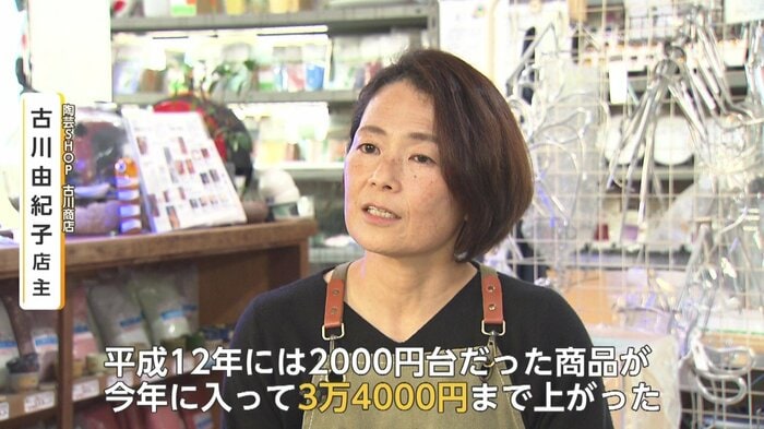 10グラムあたりの価格は、「平成12年は2000円台だった価格が、今年に入って最高額で3万4000円」となっていて、焼き物業界にとっては大きな痛手となっている。