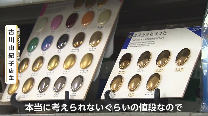 焼き物の制作に必要な道具を取り揃える佐賀・有田町の専門店は「金の絵の具」の値上がりの現状を次のように話す。