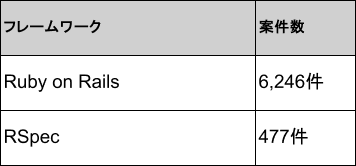 2026年4月時点のRubyフレームワーク別案件数では、1位がRuby on Railsで6,246件、2位がRSpecで477件です。
