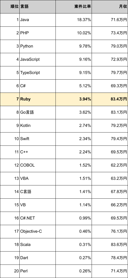 2026年4月時点でRubyの案件は市場全体の3.94%を占め、案件数は7位、平均月額単価は83.4万円と高い水準を維持しています。