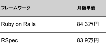 2026年4月時点のRubyフレームワーク別の月額単価は、1位がRuby on Railsで84.3万円、2位がRSpecで83.9万円です。