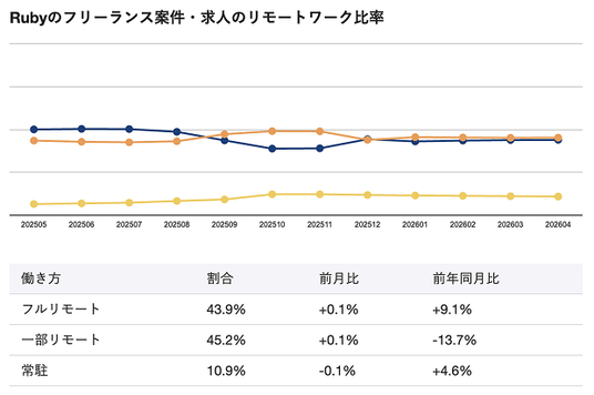 2026年4月時点のRuby向けフリーランス案件・求人におけるリモートワーク比率は、フルリモートが43.9%、一部リモートが45.2%、常駐が10.9%となっています。