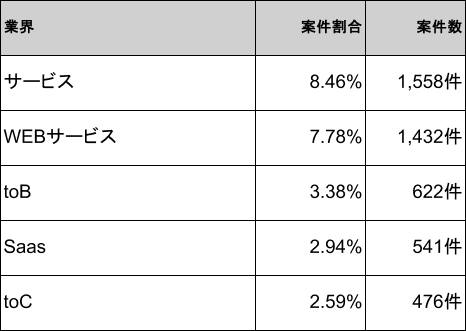 2026年4月時点のRuby案件は、サービスが8.46%(1,558件)で1位、WEBサービスが7.78%(1,432件)で2位、toBが3.38%(622件)で3位、SaaSが2.94%(541件)で4位、toCが2.59%(476件)で5位となり、上位5業界で全体の約25.2%を占めます。