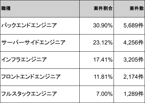 2026年4月時点のRuby案件の職種は、バックエンドエンジニア30.90%(5,689件)が最多、次いでサーバーサイドエンジニア23.12%(4,256件)、インフラエンジニア17.41%(3,205件)、フロントエンドエンジニア11.81%(2,174件)、フルスタックエンジニア7.00%(1,289件)です。