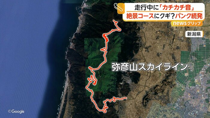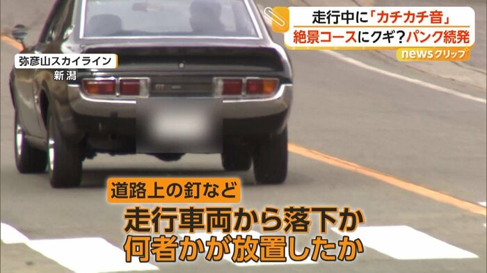 新潟県にあるドライブコース「弥彦山スカイライン」で、釘などを踏んで車が相次いでパンク被害に遭い、周辺が一時通行止めとなった。落ちていた釘などについて警察は、何者かが故意に道路上に放置した可能性も含めて調べている。