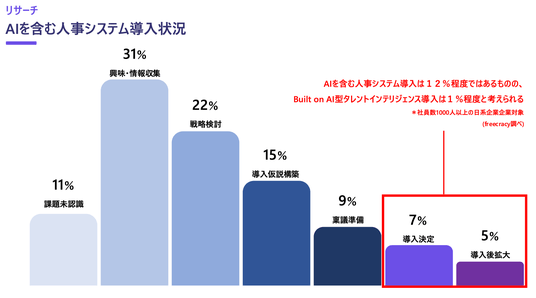 2026年に入り、企業におけるAI活用は「関心」から「実装」へと明確にフェーズが移りつつあります。内閣府が2026年2月に公表した「人工知能基本計画」でも、AI利活用の加速的推進が国家方針として掲げられており、日本全体としてAI活用を本格化させる方向性が示されています。加えて、グローバルでもHR機能の再設計やAIを活用した人材戦略の高度化が主要テーマとして扱われており、人的資本経営とAIの接続は、もはや一部企業だけのテーマではなくなっています。下記はfreecracyが独自に2025年に『AIを含むHRシステム導入』についてリサーチをした結果をまとめた図となりますが、2026年に入り、多くの企業様が情報収集・戦略検討フェーズからPoCを含む導入仮説構築や稟議準備フェーズに入ってきております。