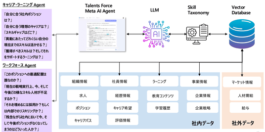 TalentsForceは、社内のあらゆる人材リソースに横断的にアクセスし、AIとスキルベースによって意思決定を支援するTalent Intelligence Platformです。スキル、ポジション、ジョブ、社員情報、学習コンテンツ、学習履歴、キャリア志向、評価情報、外部市場データ等を統合的に捉えることで、企業の文脈を理解した上で対話し、得られたデータを解析し、経営・人事における意思決定に活かすことができます。