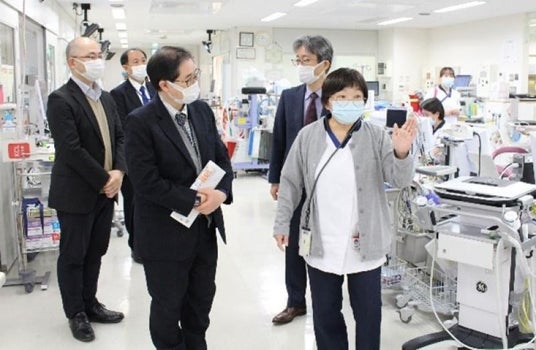 岡山大学病院ICUで医療現場の様子を視察する松尾政策参与(左から3人目)
