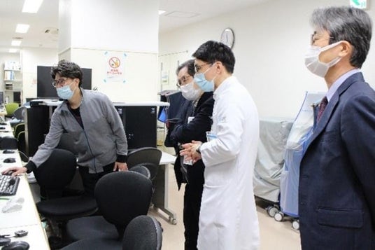 岡山大学病院IVRセンターで凍結療法の説明を受ける松尾政策参与(左から2人目)