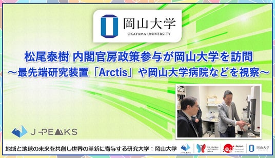 2026年3月26日、元内閣府科学技術・イノベーション推進事務局長で岡山大学経営協議会委員でもある内閣官房政策参与の松尾泰樹氏が本学を訪問し、津島キャンパスにある最先端の研究装置を視察するとともに、本学の「地域中核・特色ある研究大学強化促進事業(J-PEAKS)」による研究基盤の構築状況や、共用機器の活用体制について、意見交換を実施しました。