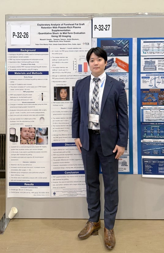 なお、PRPによる肌質改善を扱った演題は、梅田将志医師が執筆し、日本再生医療学会の公式国際誌 Regenerative Therapy に掲載された研究で得られた知見を基盤とするものです。今回の学会では、その知見を起点として、美容医療におけるPRPの客観評価の意義をあらためて発信するとともに、あわせて額脂肪注入後の定着率に関する探索的解析も報告しました。