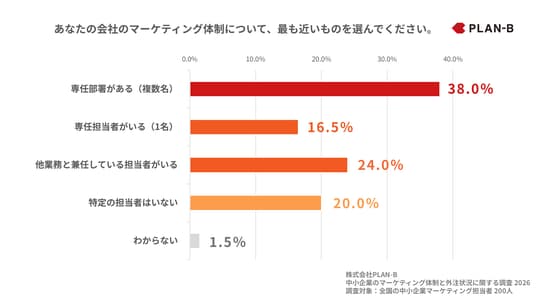 ・マーケティング「専任部署あり」は38.0%、一方で担当者不在も20.0%